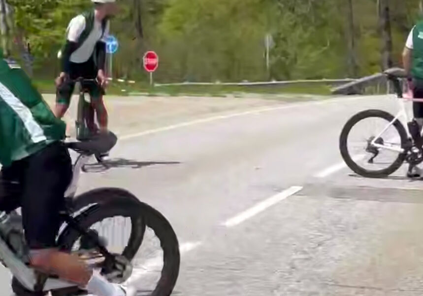 «Пелотон гнал по красивым дорогам среди гор, как вдруг у команды появился новый перспективный тренер. Он внезапно выбежал прямо на дорогу, и велосипедисты уже собирались втопить в обратную сторону, но помог клаксон — мишка испугался и убежал в лес», — говорится в сообщении.