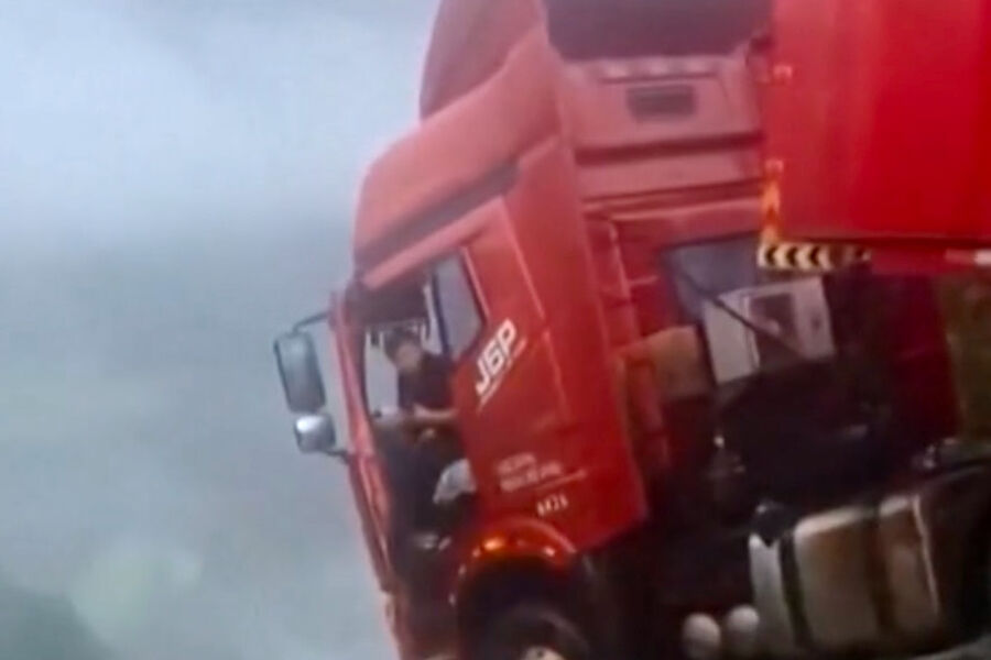 В Китае на фоне обильных дождей и оползней водитель фуры застрял в кабине над обрывом. Видеозапись инцидента публикует metro.co.uk