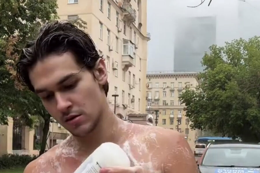 На опубликованных в сети кадрах видно, как мужчина в одном полотенце стоит возле дороги. Москвич наливает гель для душа на мочалку, мылится и моет голову водой из лужи на проезжей части. Далее на записи видно, как мужчина чистит зубы.