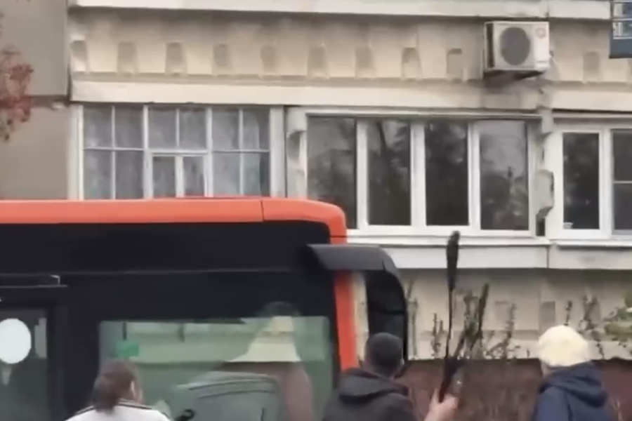 На кадрах с места инцидента заметно, как мужчина наносит удар в стекло водителя и срывает деталь с автобуса, после чего приближается к другому окну и, с помощью детали, разбивает стекло. Затем автобус уезжает.
