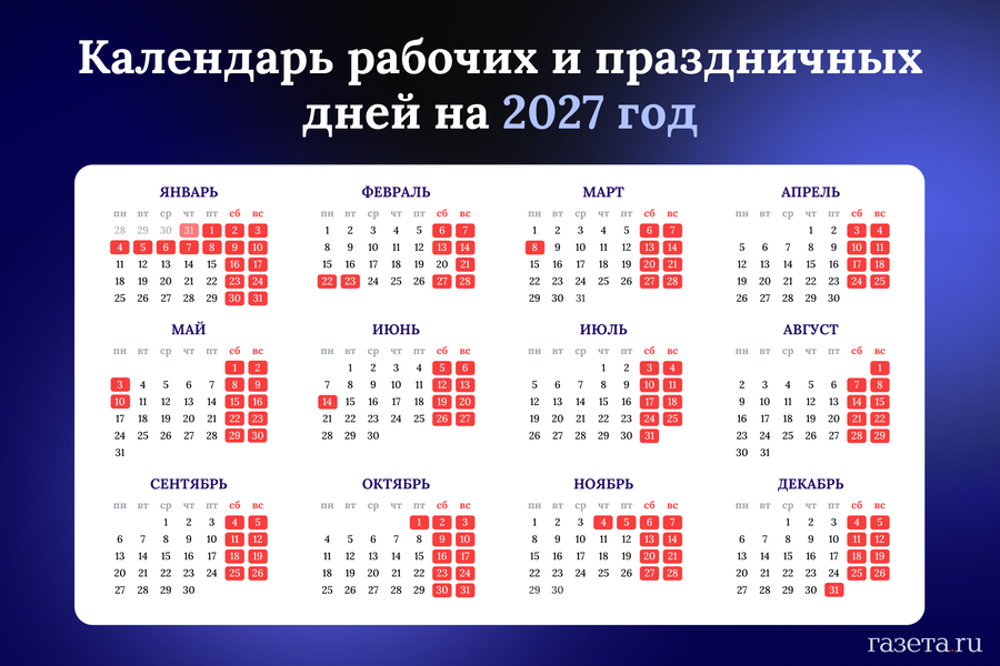 Календарь рабочих и праздничных дней на 2027 год «Газета.Ru»