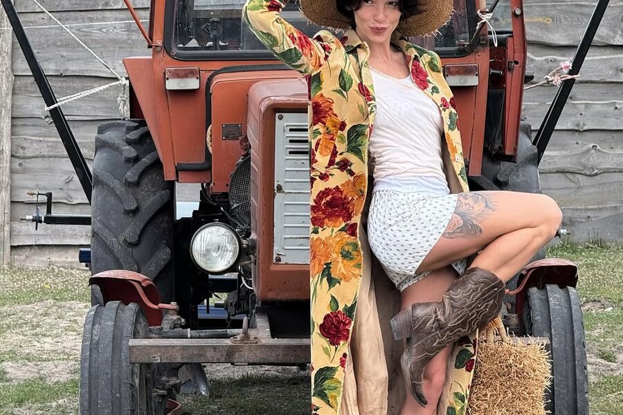 34-летняя Анастасия Ивлеева показала кадры, сделанные во время съемок ее нового шоу «Чегеря» о жизни в деревне. На одном из снимков телеведущая предстала в кадре в белой майке, «семейных» трусах, желтом пальто с цветочным принтом и коричневых кожаных казаках. Блогерша добавила к образу соломенную шляпу и сумку. Знаменитость позировала с распущенными волосами и без косметики у трактора.