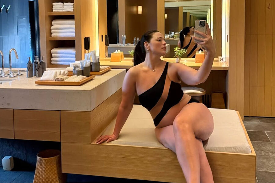 Эшли Грэм показала фигуру с растяжками в «голом» черном купальнике. Модель позировала сидя на кресле. Она также отказалась от макияжа и укладки.