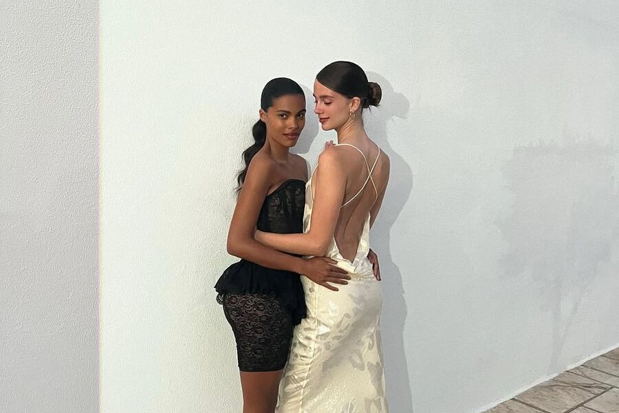 Тина Кунаки позировала в черном мини-платье из прозрачного кружева с баской, которое дополнила босоножками на каблуках в тон. Визажист сделал манекенщице макияж с бордовой помадой, а стилист собрал волосы в высокий гладкий хвост. Звезда стояла, обнимая подругу.