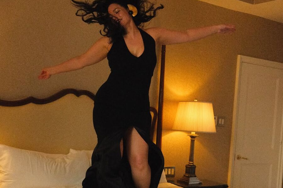 Эшли Грэм попрыгала на кровати в черном платье с глубоким декольте, открытыми плечами и разрезом до бедра. Волосы ей выпрямили и сделали вечерний макияж.