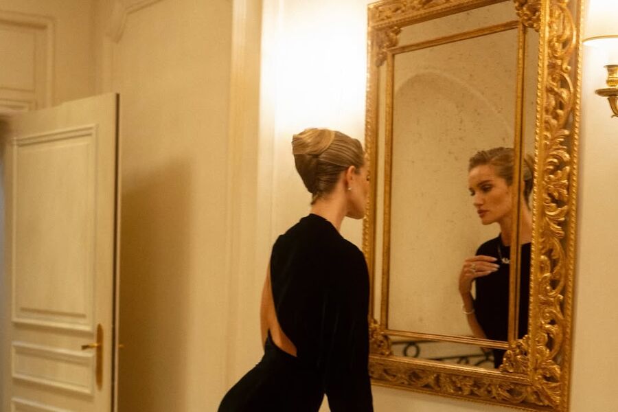 38-летняя Рози Хантингтон-Уайтли позировала в черном облегающем платье с голой спиной и разрезом до бедра. Волосы ей собрали в высокий пучок и сделали вечерний макияж. Модель позировала напротив зеркала в золотой раме.