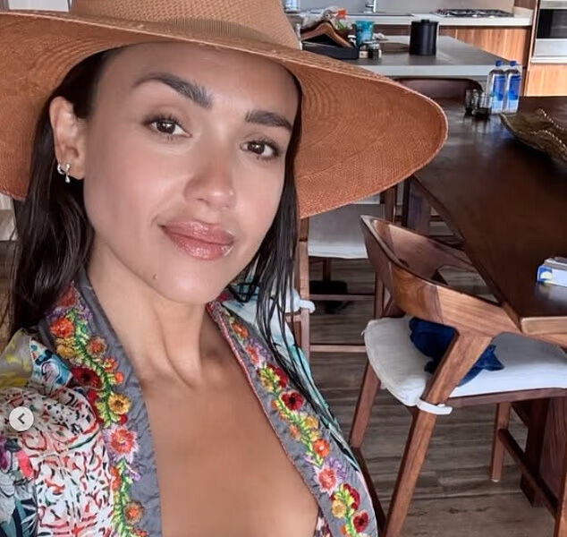 44-летняя Джессика Альба предстала в бордовом крошечном лифе бикини с принтом, который сочетала с разноцветной накидкой с вышивкой и голубыми джинсовыми шортами. Актриса также добавила к пляжному образу серьги и соломенную шляпу. Знаменитость позировала с распущенными волосами и без косметики.