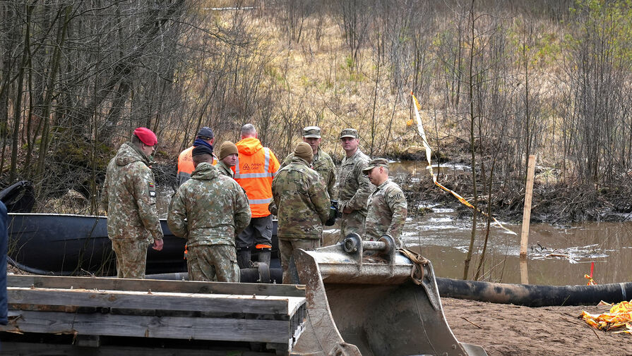 Для того чтобы подобраться к месту затопления, литовские военные начали насыпать земляную дамбу.