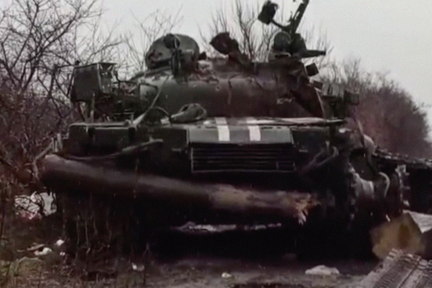 Также в ролике демонстрируются оставленные американские противотанковые ракетные комплексы «Джавелин». На представленных кадрах заметен подбитый танк Т-80. У военной техники отлетела и размоталась по дороге правая гусеница.
