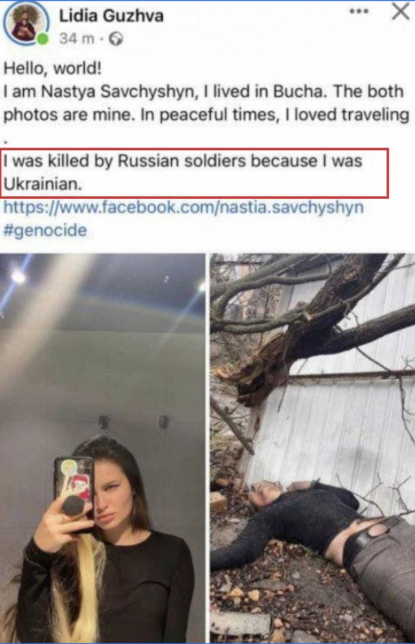 Показательной является и история местной жительницы, которая якобы «погибла от рук российских солдат». Фото с трупом молодой девушкой были опубликованы во многих западных СМИ.