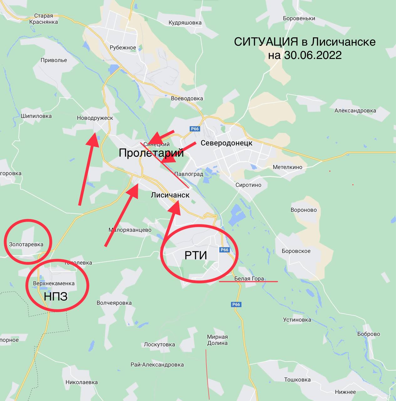 Он добавил, что на правом берегу Северского Донца создан большой плацдарм в районе вертолетной площадки — оттуда ведется наступление в сторону центра Лисичанска. Еще один удар наносится по городу-спутнику Лисичанска, Новодружеску.