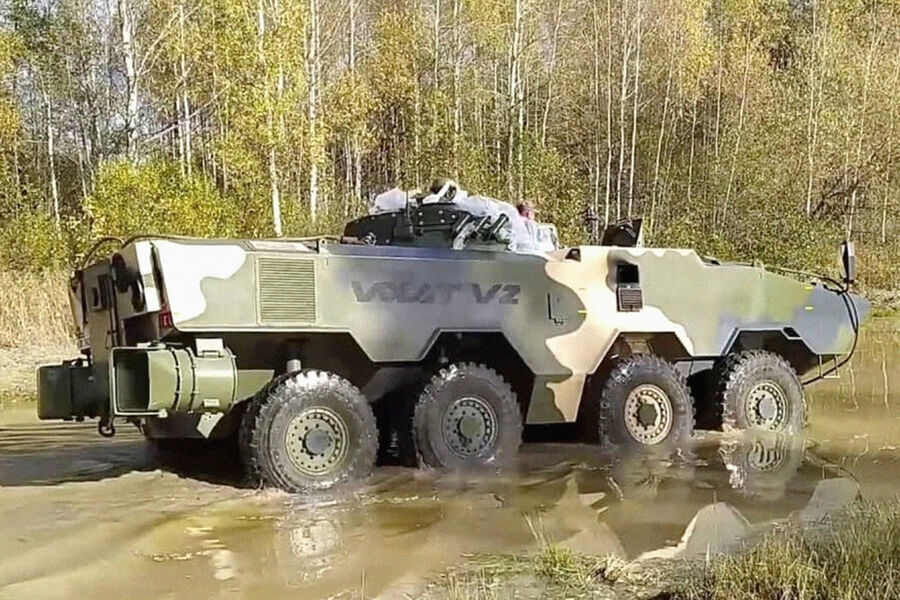 На форуме показан опытный образец БТР, который прошел испытания и готов к продаже. Машина получила энергопоглощающие сиденья и подвесной пол, который смягчает ударную волну при подрыве. БТР может перевозить личный состав, обеспечивать огневую поддержку и бороться с бронетехникой. БТР весит 22 т, его скорость по шоссе может достигать 110 км в час, плавает он со скоростью до 10 км в час.