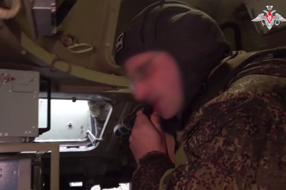 На кадрах видно, как военнослужащие настраивают радиоаппаратуру, установленную на шасси БТР-80 (УНШ-10). При этом машина двигается по пересеченной местности.