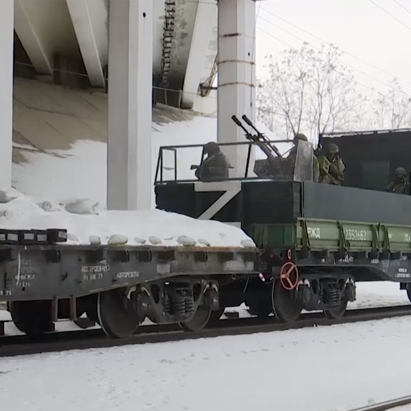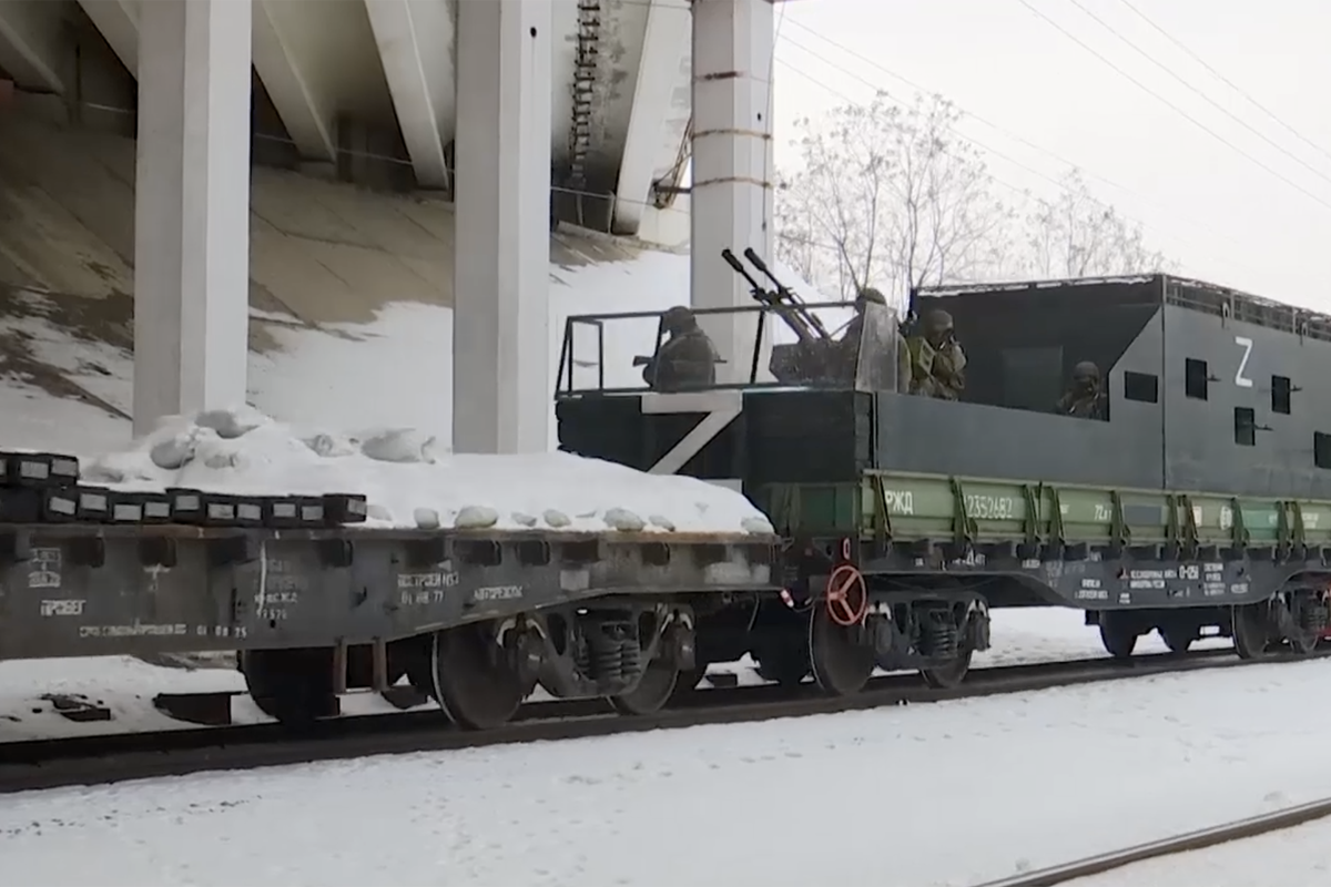 На кадрах показано, как поезд двигается по зимней железной дороге, военнослужащие находятся в кабине машиниста, за зенитным орудием, установленным на платформе, а также в вагоне, выставив в окно автоматы и пулеметы.