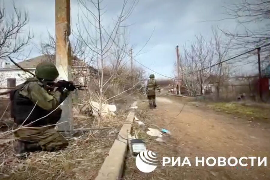 На кадрах показано, как группа военнослужащих передвигается между полуразрушенными домами и ведет стрельбу.
