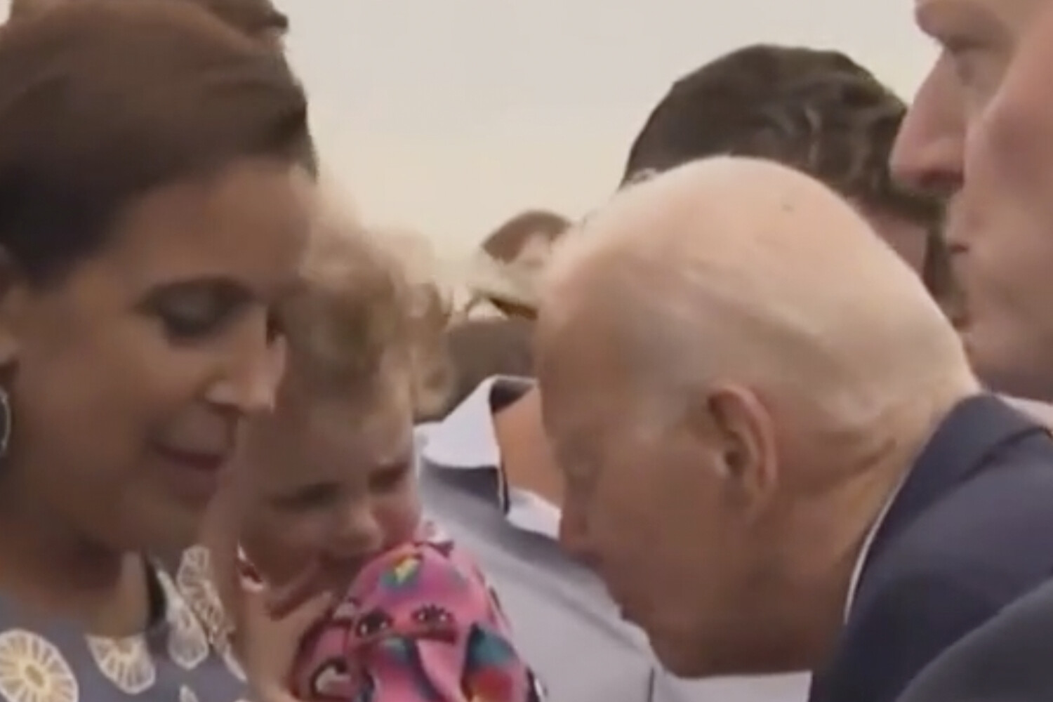 На кадрах видно, что маленькая девочка, которая сидит на руках у матери, испугалась приближения Байдена и пыталась увернуться.