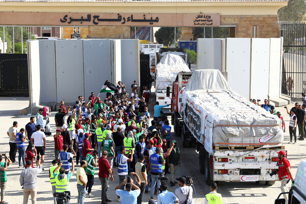 Гуманитарную помощь в сектор Газа привозят на грузовиках через контрольно-пропускной пункт «Рафах» на границе Газы и Египта. О прибытии лекарств и другого гуманитарного груза сообщалось 21, 22, 23 и 25 октября.