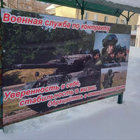 Плакат, большую часть которого занимает снимок танка Leopard, установлен в нескольких метрах от входа в военкомат.