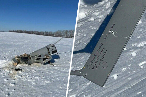 На снимках видны лежащие в снегу обломки упавшего дрона. На нем написано: «Горячий привет Липецкому металлургическому комбинату». Рядом с надписью украинские военные пририсовали сердце.