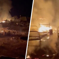 На кадрах показаны остатки палаток, горящие двухъярусные кровати армейского образца.