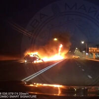 На кадрах с видеорегистратор зафиксировал попадание в ехавший навстречу по дороге автомобиль, после чего произошел мощный взрыв. Еще один снаряд попал в деревья, которые стояли вдоль трассы.