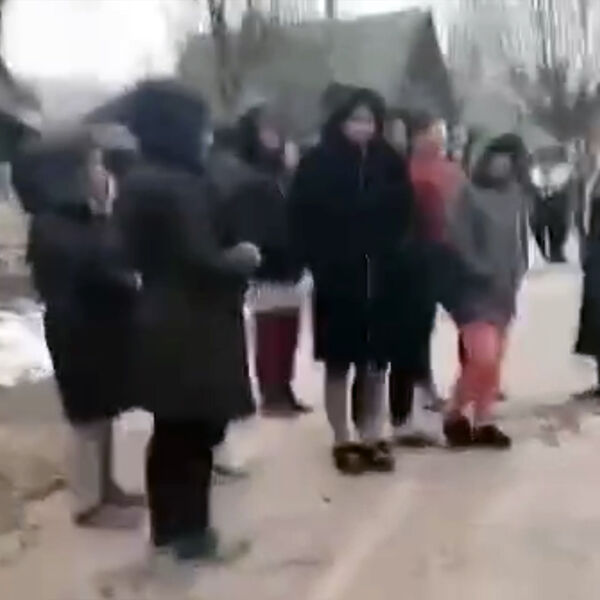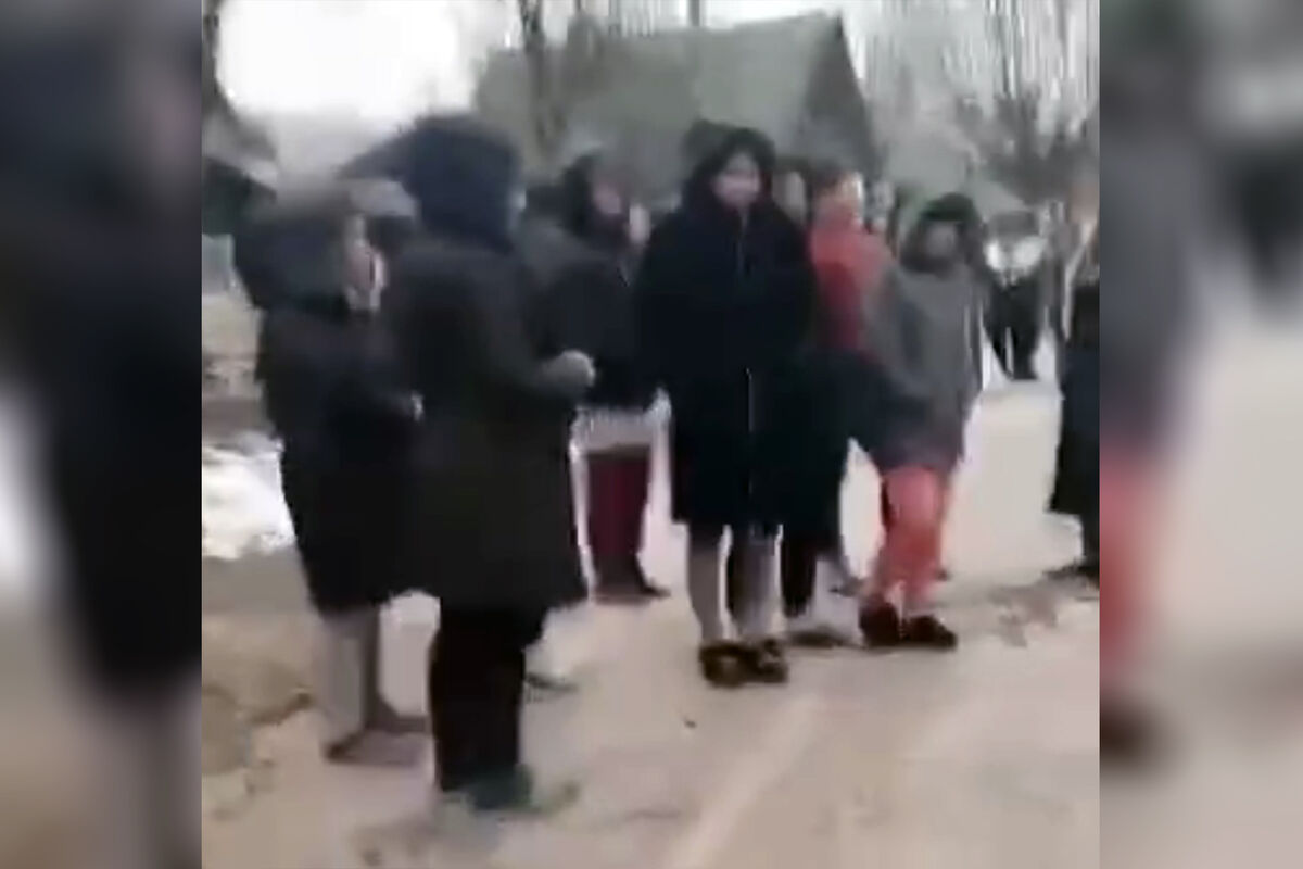 Материал дополнен видеозаписью, сделанной на месте событий. На кадрах можно увидеть дорогу, на которой скопилось большое количество полицейских машин. При этом между ними ходят женщины и громко возмущаются, что мужчин принудительно отправляют на фронт.