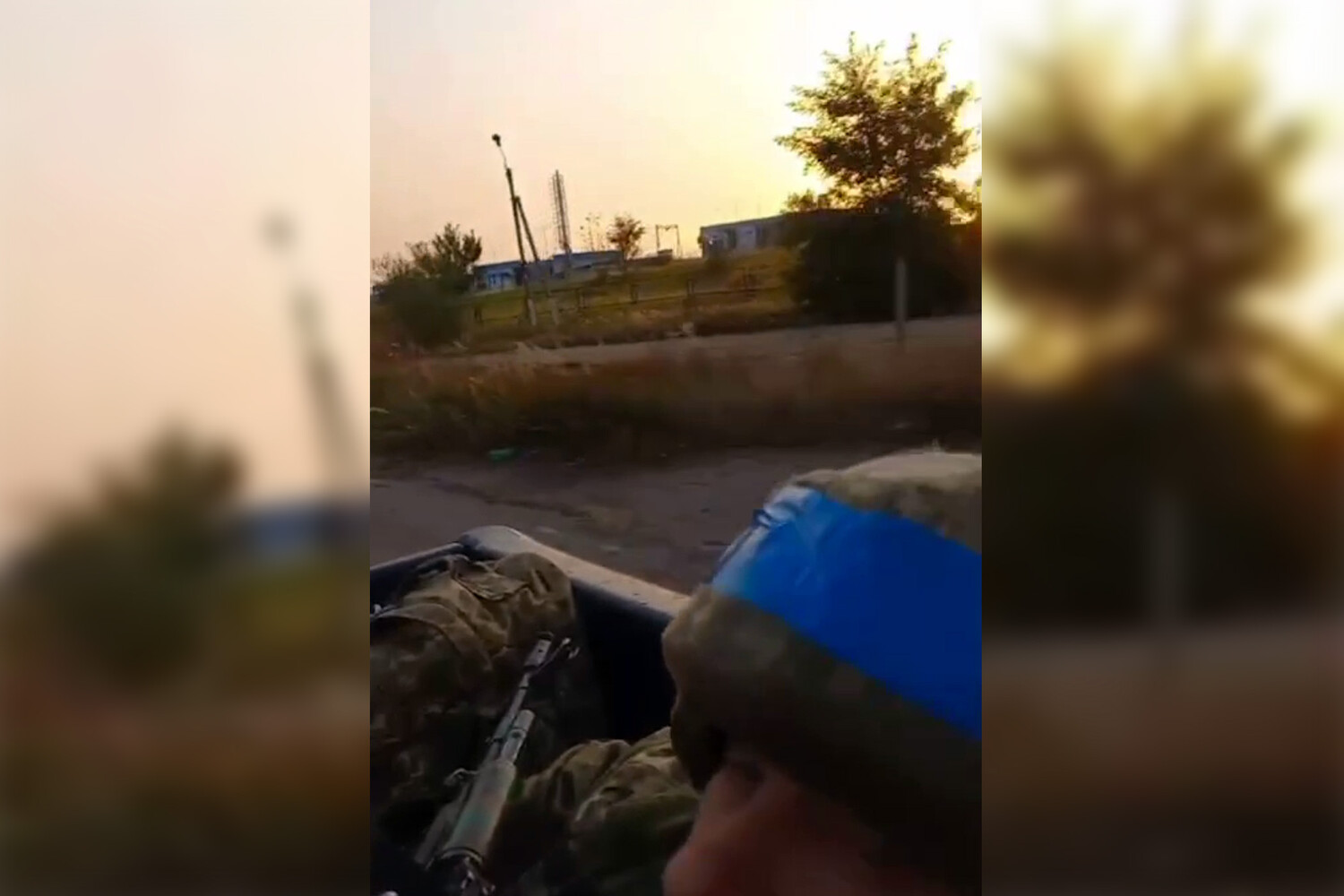 На видео показана местность, которую сняли в конце лета или в начале осени. На кадрах видно, как украинский боец вместе с сослуживцем едет в кузове грузовика по дороге, по бокам которой полуразрушенные здания, а на обочине видны противотанковые треугольники. В кадр еще попал прикрепленный на забор указатель «Суджа».