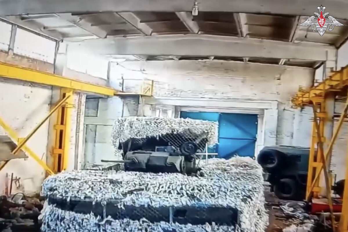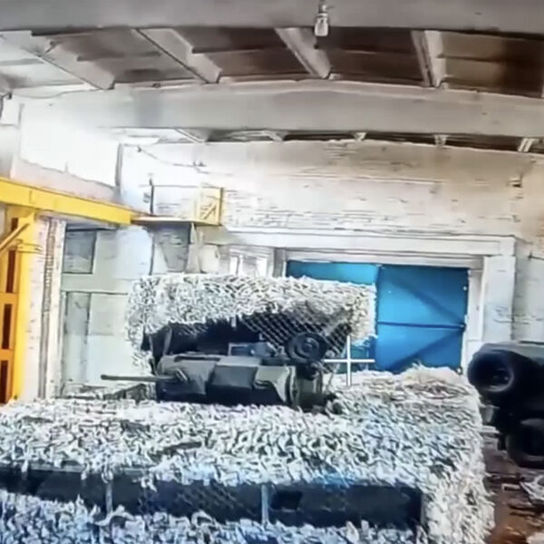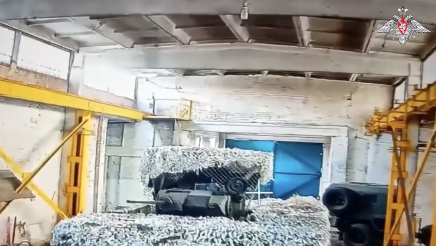 Видео снято с двух ракурсов: от лица дрона, залетевшего в ангар и подорвавшего бронетехнику, а также от лица беспилотника, запечатлевшего взрыв со стороны.