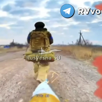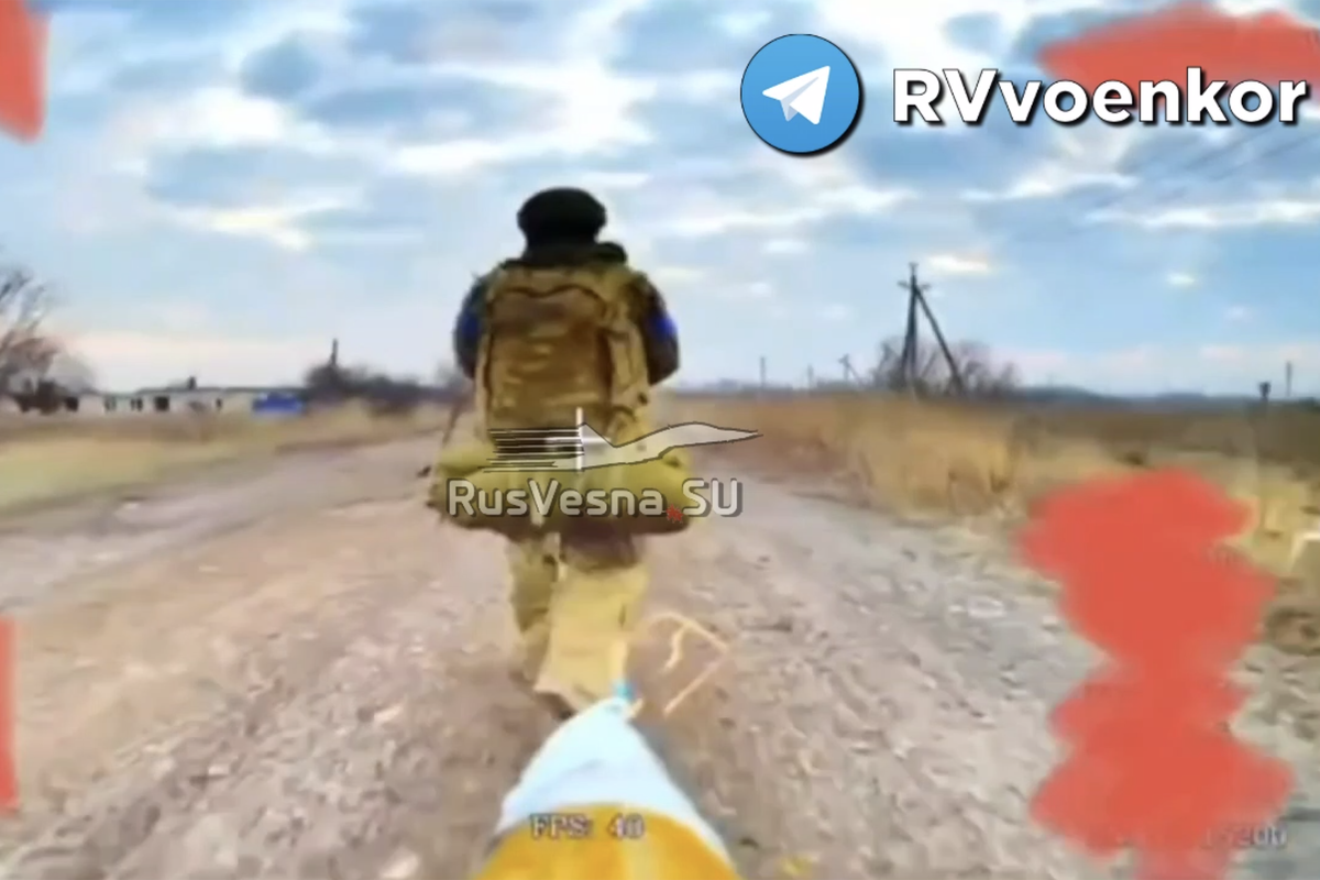 На видео попал момент, как один украинский военный идет по дороге, а беспилотник-камикадзе подкрадывается к нему со спины и врезается в ягодицы. Почему боец был на открытой местности и не следил за небом, неизвестно.