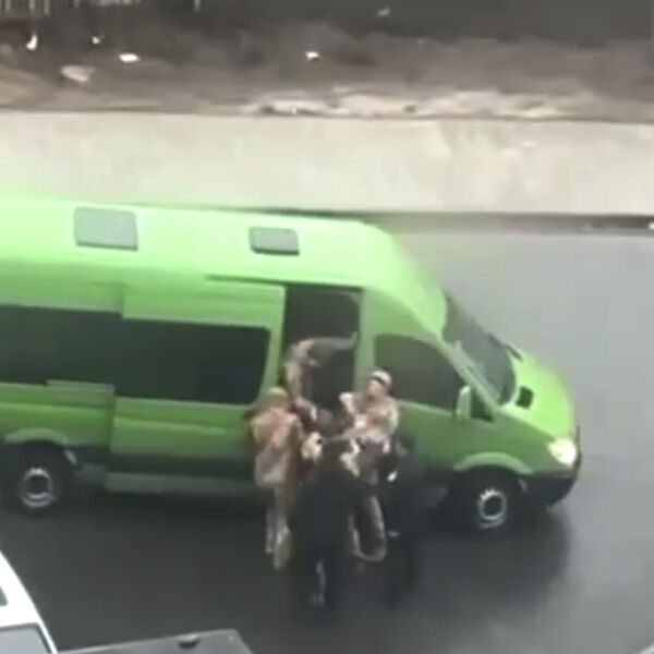 На записи видно, как военкомы заталкивают отбивающегося мужчину в зеленый микроавтобус (бус), после чего садятся в машину и уезжают. Среди сотрудников ТЦК (территориального центра комплектования, аналога военкомата) шесть человек в камуфляжной форме и двое в черной одежде.