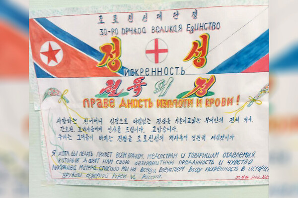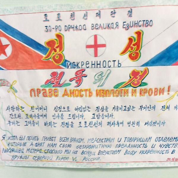 На одном из самодельных плакатов изображены флаги России и Северной Кореи, а также слова бойца из КНДР, который передал привет врачам и медсестрам, которые дарят «безграничную преданность».
