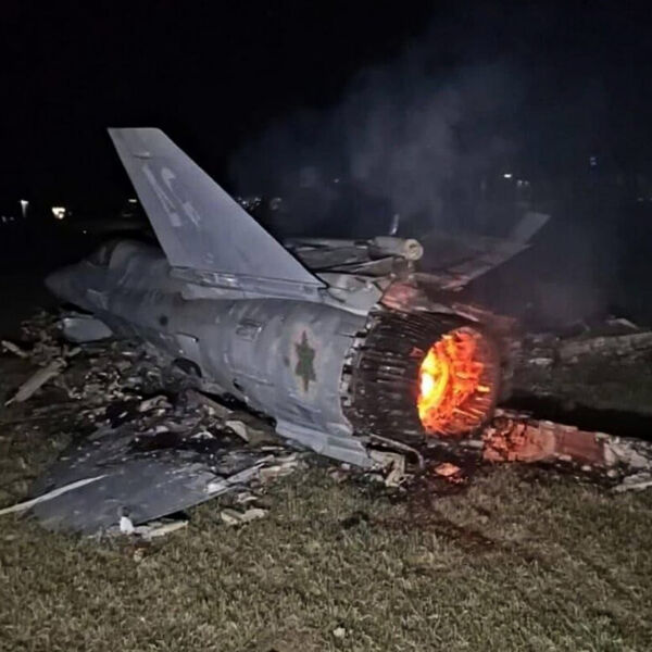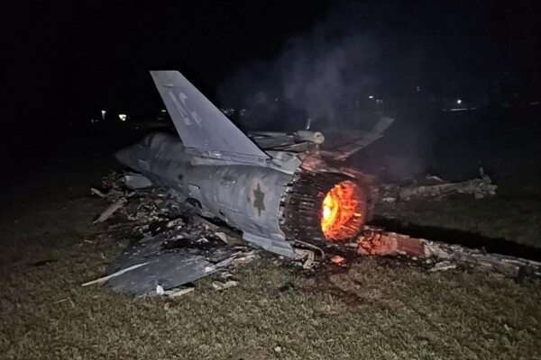 На снимке можно увидеть фюзеляж и тлеющее сопло истребителя.