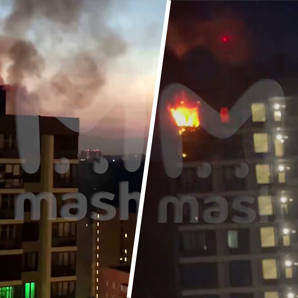 По данным канала, огонь вспыхнул после того, как в здание попал беспилотник. На записи видно, как пламя охватывает одну из квартир на верхнем этаже. Судя по кадрам, огонь быстро распространялся.
