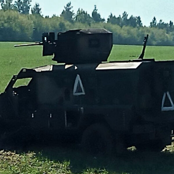 На кадрах видны грузовики, бронемашины, а также бронетехника на гусеничном шасси. На одной из них виден след от снаряда, пробившего правый борт.