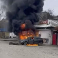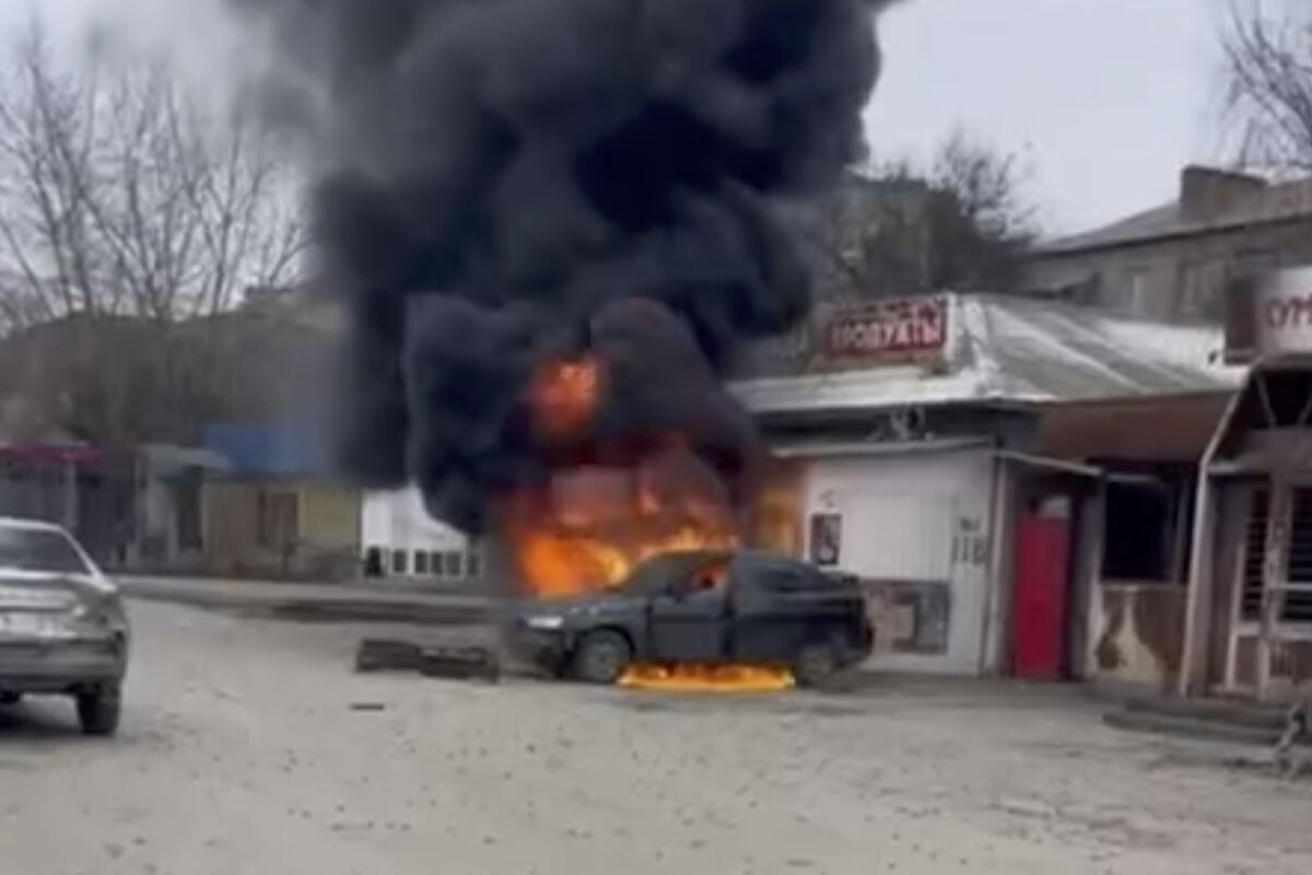 Публикация дополнена кадрами с места происшествия. На них видно, что после атаки БПЛА автомобиль загорелся.
