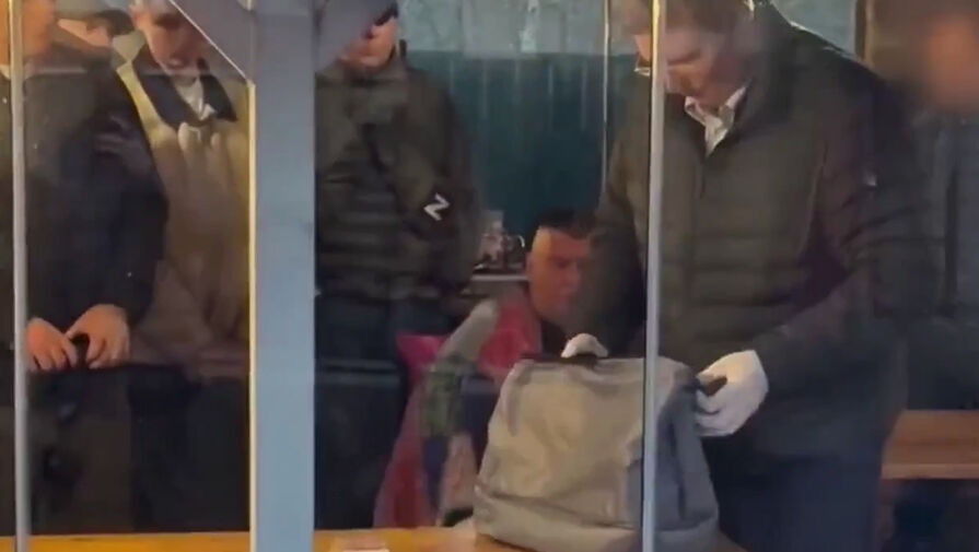 На видео показано, как один из следователей проверяет серый рюкзак в перчатках. При этом на столе лежат пачки купюр.