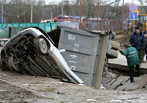 В четверг около девяти часов утра в Южном Бутово произошел провал грунта. Как рассказали «Газете.Ru» в отделе ГИБДД ЮЗАО, многотонный автомобиль «КамАЗ», груженный землей, двигался по улице Изюмской. Внезапно под машиной провалился асфальт, и грузовик ушел под землю и увлек за собой в образовавшуюся яму три легковых автомобиля. «Машины стояли, припаркованные у обочины, в них никого не было. Яма стала расширяться, и автомобили втянуло вслед за большегрузом», — рассказал инспектор ГИБДД. По данным «Интерфакса», диаметр ямы — около 20 метров. По предварительной версии правоохранительных органов, причиной провала могли стать вышедшие из строя коммуникации водоснабжения. Вода подмыла грунт, и «подушка» под асфальтом не выдержала тяжелого «КамАЗа». В аварии никто не пострадал.