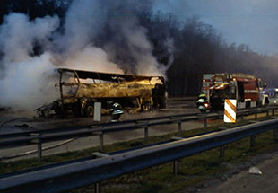 После столкновения автобус воспламенился. Огонь быстро распространился по всему периметру транспортного средства. По данным МЧС, сообщение о ДТП поступило через 35 минут после происшествия от очевидца. Прибывшие через 15 минут (в 4.40) пожарные обнаружили уже догорающий кузов автобуса. Еще через 15 минут пожар был потушен.