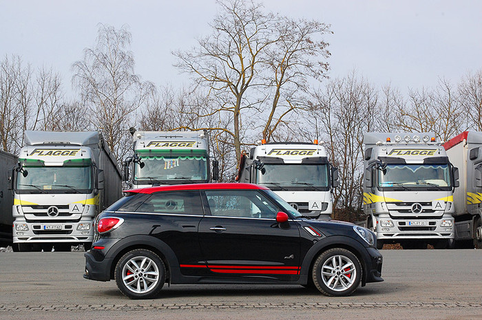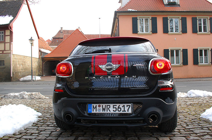 Так как в наши планы входило провести фотосессию, на подъезде к Нюрнбергу, увидев очередной съезд с автобана на обычную дорогу, мы решили воспользоваться случаем и отправится на поиски удачного места для сьемки. Надо сказать, что машина произвела впечатления даже на неискушённых немцев. На заправке владелец Volkswagen Golf с улыбкой на лице попросил сделать на свой телефон несколько фотографий его на фоне Paceman. Закончив сьемку, мы съехать с дороги, чтобы испробовать полный привод, но почти сразу же вернулись обратно. Довольно низкий клиренс (на 35 миллиметров меньше, чем у Countryman) не добавляет уверенности при движении по пересеченной местности. Полный привод этой машине нужен больше для того, чтобы крепко держаться за дорогу и брать штурмом вираж за виражем, а не пробираться сквозь грязь и снег, поскрёбывая «брюшком» землю.