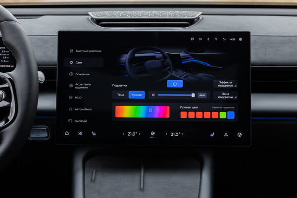 Физические кнопки тоже есть, но их немного и все они сосредоточены на центральной консоли: выбор режимов движения, включение кондиционера, аварийка, подогрев стекол. В перспективе появятся машины со сдвижным, в сторону пассажира, экраном.