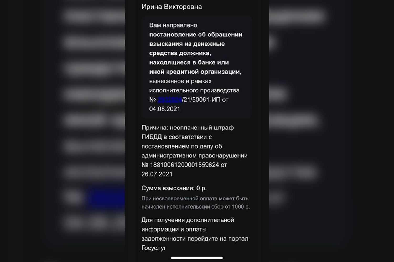 Россиянка получила сообщение о взыскании с нее задолженности в ноль рублей за неоплаченный штраф ГИБДД, при этом у женщины нет ни одного автомобиля уже более 10 лет. Изображение с уведомлением об оплате опубликовало сообщество «Синие Ведерки».