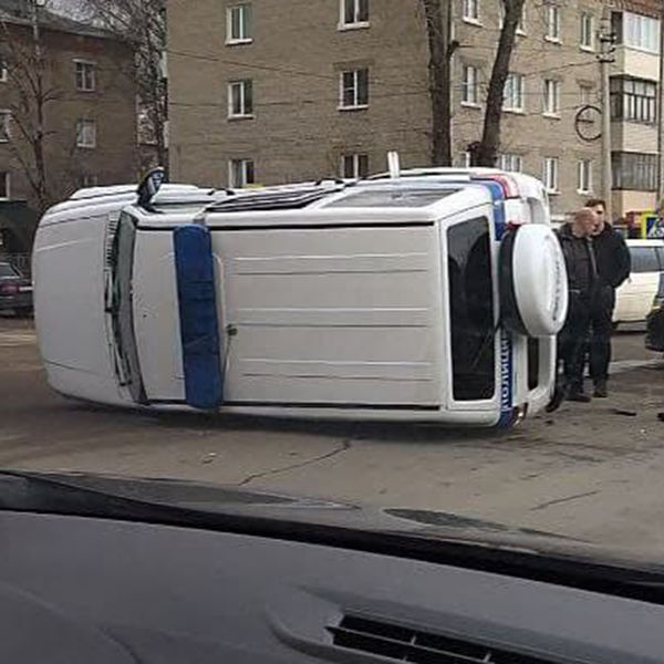 На записи видно, как на перекрестке ВАЗ-2107 врезается в правый бок полицейского «Патриота», после чего тот опрокидывается. Автомобиль «Жигули» получил сильные повреждения.