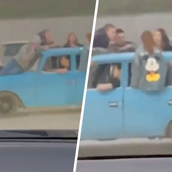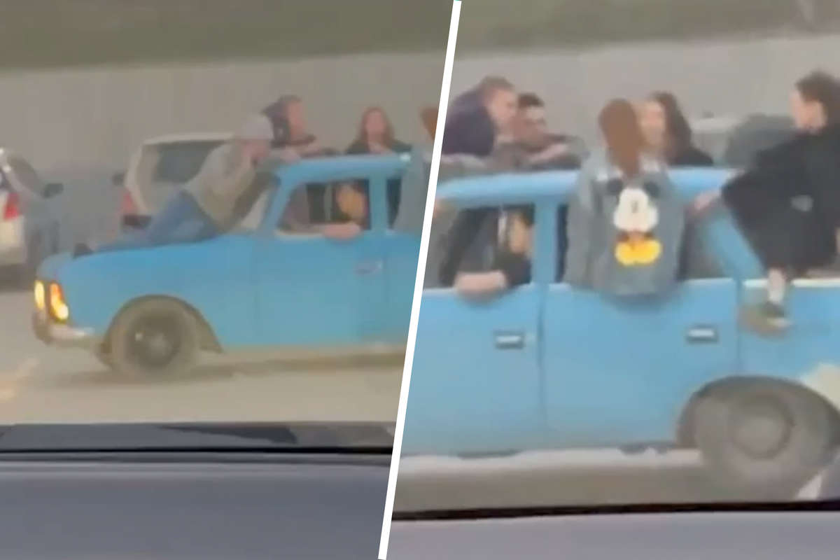 При этом двое мужчин сидят на корточках на багажнике автомобиля, а еще два человека почти всем телом высунулись из окон с задних сидений и держатся за крышу.