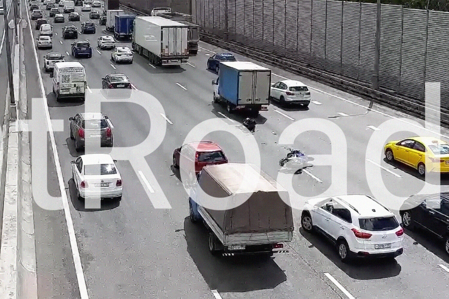 Судя по кадрам, автомобиль Fiat Punto пытался перестроиться из второй в третью полосы и не пропустил мотоциклиста. От удара байк откинуло под «Газель», двигавшуюся в четвертом ряду. Мотоциклист оказался под колесами грузовика, но выжил.