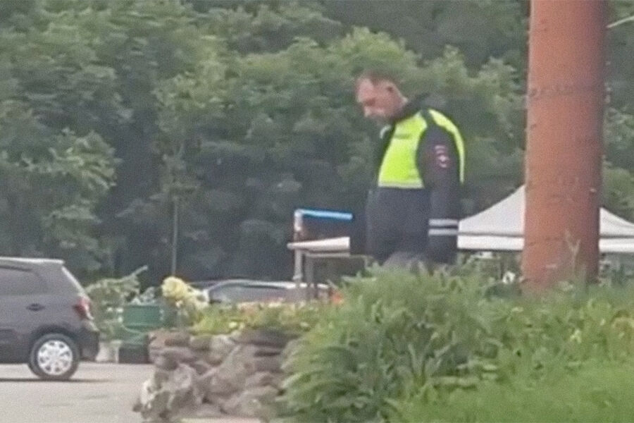 Мужчина в куртке сотрудника Госавтоинспекции сел за руль автомобиля и въехал в бордюр в Надеждинске Приморского края. Видео разместил Telegram-канал »ДПС Владивосток. Новости».