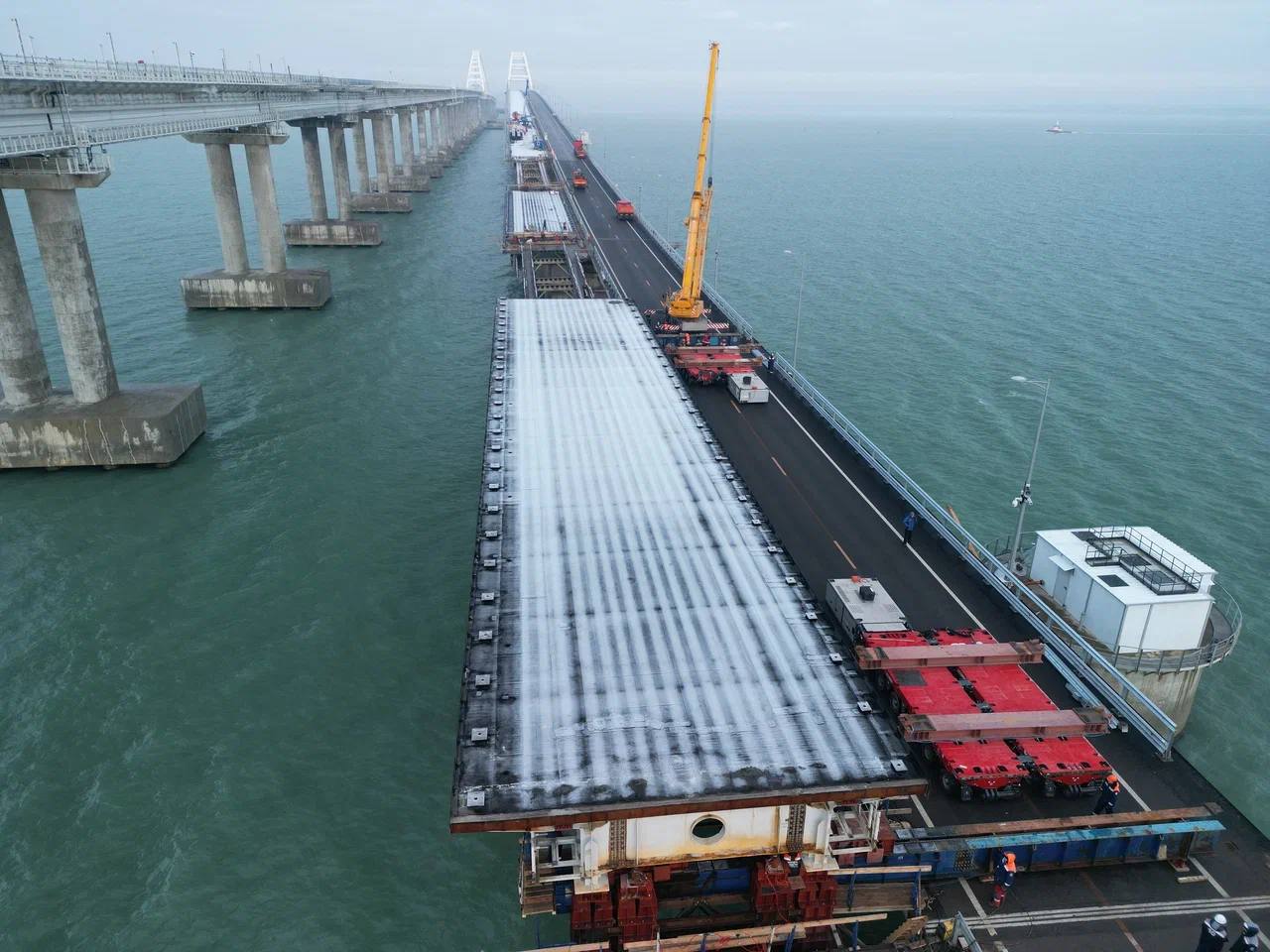 Вице-премьер РФ Марат Хуснуллин в своем Telegram-канале сообщил о завершении работ по надвижке второго пролета по левой стороне автомобильной части Крымского моста.