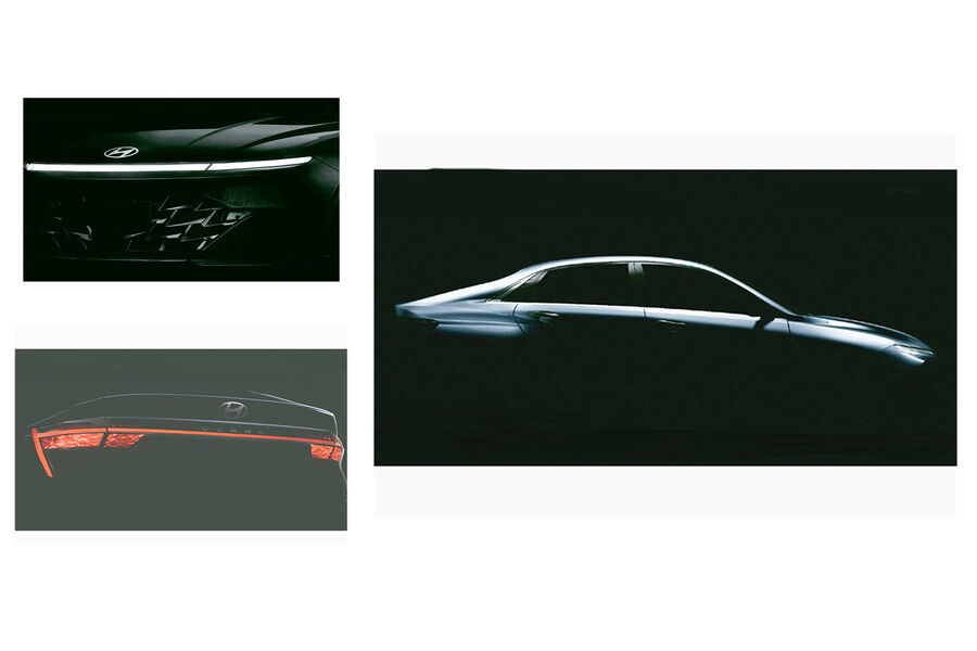 На тизерах Hyundai показала решетку радиатора светящуюся полосу спереди, фонари с горизонтальным светодиодным элементом и боковую часть кузова.