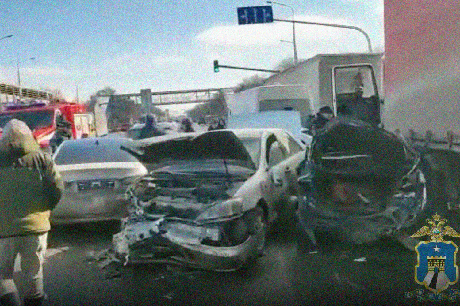 Ранее сообщалось о семи поврежденных автомобилях и двух пострадавших. По предварительной информации, причиной массового ДТП стал отказ тормозной системы большегрузного автомобиля.