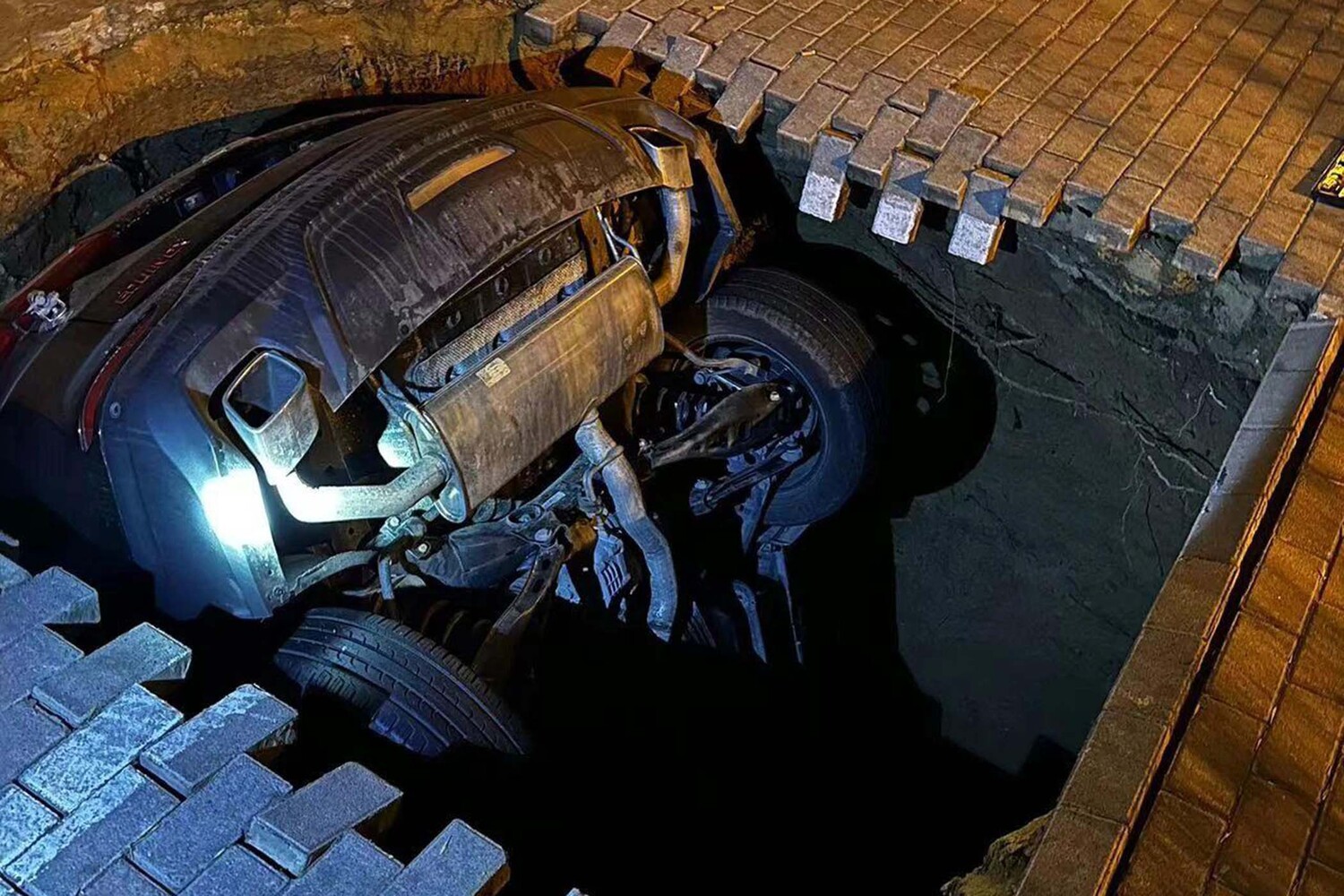 Отмечается, что мужчина подошел к своему припаркованному автомобилю и сел в водительское кресло. Когда он запустил двигатель, под передними колесам провалился грунт. Машина накренилась, но мужчина успел выскочить до того, как она упала в образовавшуюся яму.