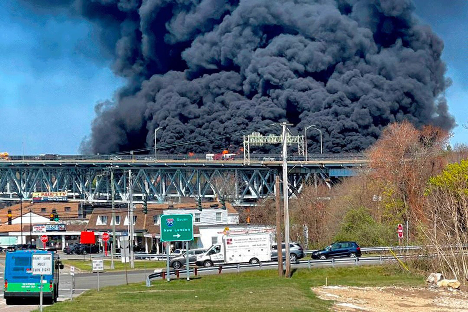 В американском штате Коннектикут на мосту Golden Star перевернулся бензовоз. Об этом сообщает Telegram-канал Shot. В результате возгорания произошел мощный взрыв.